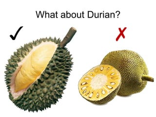 Buah berbentuk bulat bujur kulit buah berwarna hijau perang dan durinya pendek. Di dalam buku ini juga pembaca dapat mempelajari danmemahami kaedah-kaedah bagaimana pengesahan pokok mat atunas d an anak pokOk durian itu pernbaca dengan ciri ciri anak pokok setiap varieti durian yang telah disyorkan oleh Jabatan Pertanian varieti-. Untuk pokok-pokok durian yang pertama kali hendak disembur dengan cuka kayu bancuhan sebaiknya perlu dicairkan lagi sebagai membiasakan.