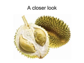Pengenalan Durian Bahagian 1 DURIAN Durio species merupakan sejenis buah-buahan tropika yang sangat popular di Asia khususnya di Asia Tenggara seperti Malaysia Thailand Indonesia dan sebagainya. Hal-hal yang dibicarakan meliputi. Pokok sederhana besar dan tahan kepada keadaan kering.